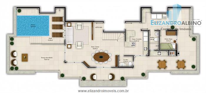 Sala de estar e jantar, cozinha, bwc social, lavabo, área de serviço, sacada com churrasqueira e opção de 1 ou 2garagens.