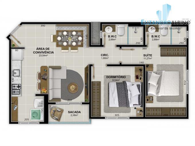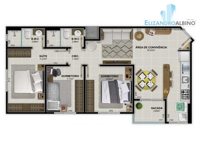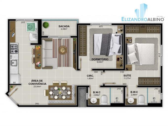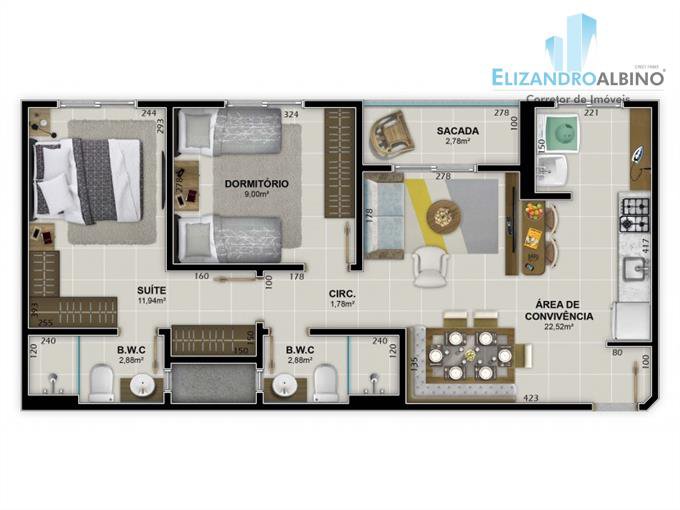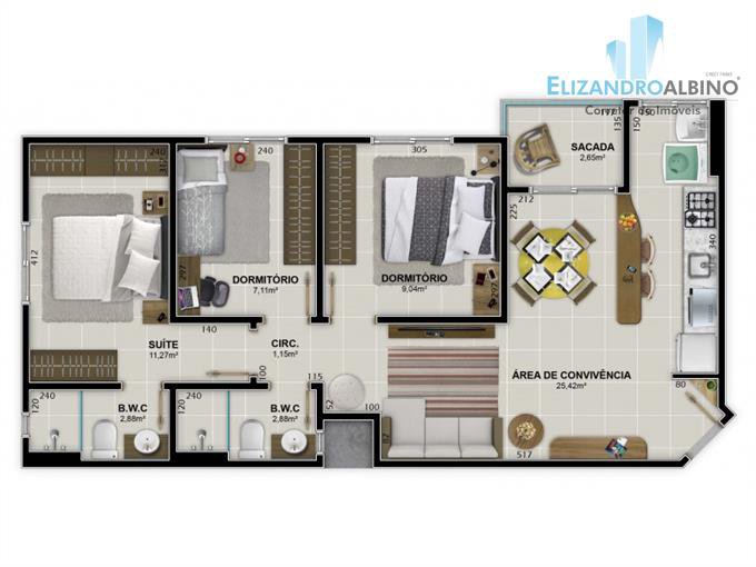 • Apartamentos de 2 dormitórios com suíte, sala de estar e jantar com sacada,