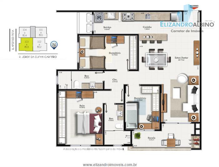 banheiro suite, cozinha, área serviço, sacada com churrasqueira.