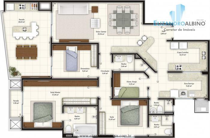 Apto Tipo - 01 Suíte Master,01 Suíte e 01 Dormitório + dep. de empregada.