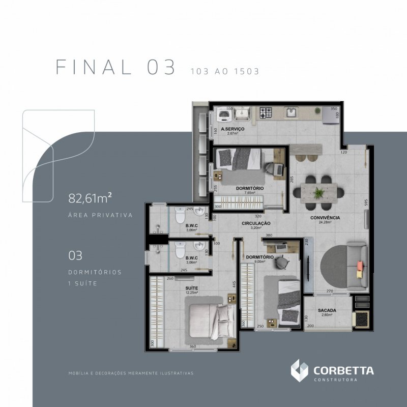 Apartamentos com 03 dormitórios sendo 01 suíte (04 por andar pontas);