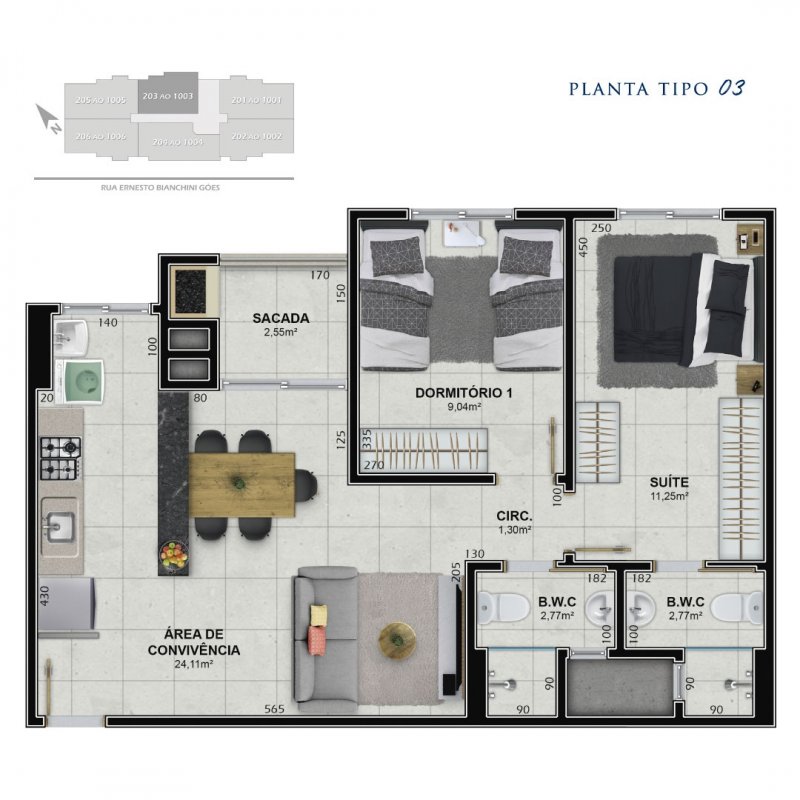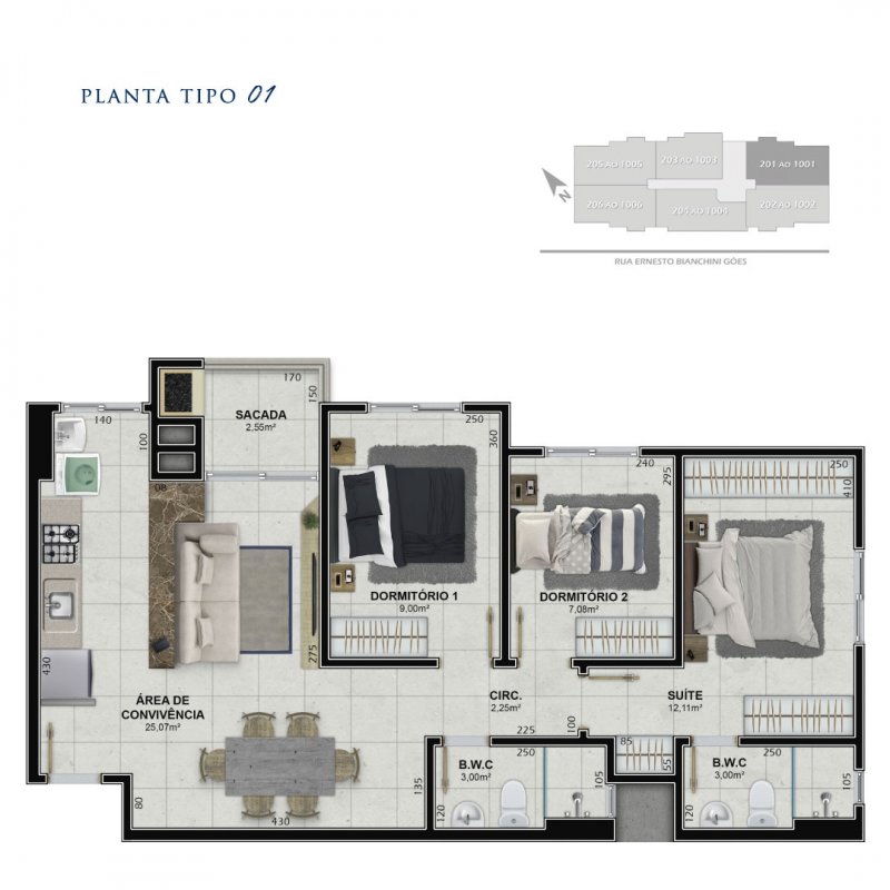 - Aptos de 03 dorm. (01 suíte) 73m² privativo e 101m² total
