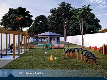 - Espaço agility (Inspirado no hipismo, o agility é um esporte em que o cachorro precisa percorrer uma pista de obstáculos no menor tempo possível. Ele ajuda a aumentar o condicionamento físico, a socialização e também a assimilar os comandos que recebe de seu condutor);