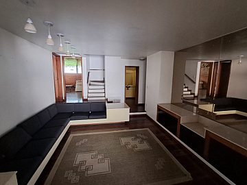 - Andar inferior: sala de estar/jantar, estar intimo, escritório, cozinha, lavabo, área de serviço, dependência de empregada com banheiro, garagem com espaço para até quatro carros e churrasqueira a carvão.